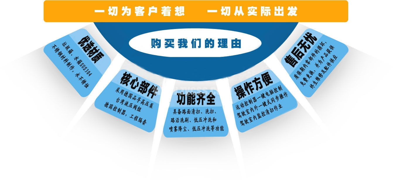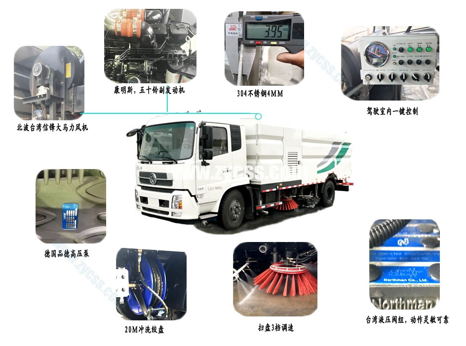 1、帶2個(gè)中置掃盤;中置超寬吸嘴;雙層吸塵筒;康明斯170馬力副發(fā)動(dòng)機(jī);臺(tái)灣液壓閥;大力馬達(dá);德國(guó)高壓水泵(前沖/側(cè)噴/中噴/后噴霧)/側(cè)沖洗水槍/垃圾箱自潔裝置);萬(wàn)向高壓路沿清洗;威龍低壓泵(前沖),氣動(dòng)球閥控制;4mm不銹鋼垃圾箱;不銹鋼水箱;德國(guó)控制器;尾部箭頭燈;機(jī)油、垃圾箱、水箱均帶防溢或低位報(bào)警裝置;倒車及洗掃狀態(tài)室內(nèi)監(jiān)視器;多種語(yǔ)音提示;倒車自動(dòng)保護(hù)、防傾倒垃圾翻車保護(hù)、檢修安全保護(hù);20m高壓沖洗卷盤;刷臂轉(zhuǎn)動(dòng)機(jī)構(gòu)使用德國(guó)進(jìn)口高新耐磨工程隔套,免打黃油;精密冷彎無(wú)縫液壓油管;運(yùn)動(dòng)控制器一鍵電腦控制。
